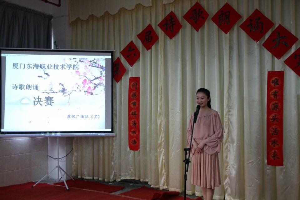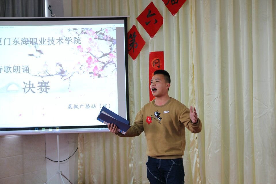 为加深同学们对民族精神和优秀文化的理解,在诵读中亲近经典,在亲近中热爱经典,在热爱中弘扬经典。由校团委主办、校晨枫广播站承办的第六届诗歌朗诵比赛,3月29日在校图书馆举行。出席此次活动的嘉宾有:思政科负责人沈秋贤老师、团委李嘉欣、黄彩燕及王蓓老师、二级学院团总支书记杨郑军和俞鑫老师、各体系及各团总支也派代表到现场观摩学习呐喊助威。