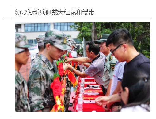最后,欢送仪式上各领导为13名新兵佩戴光荣花和绶带,班级代表为新兵献上祝福的鲜花。全体新生列队欢送新兵,13名新兵身着迷彩服,胸带大红花,将从这里踏上奔赴绿色军营的列车,实现青春梦想。