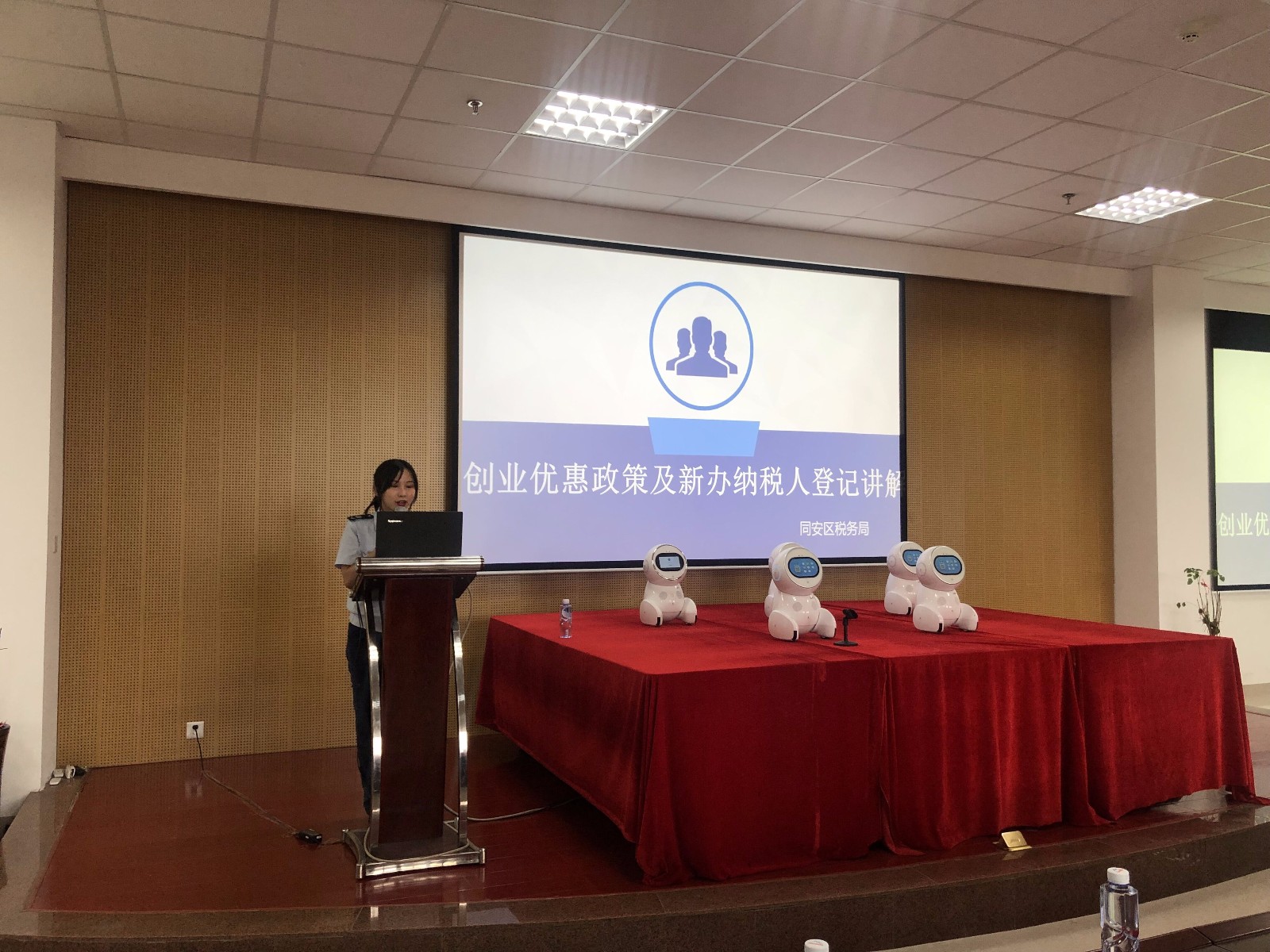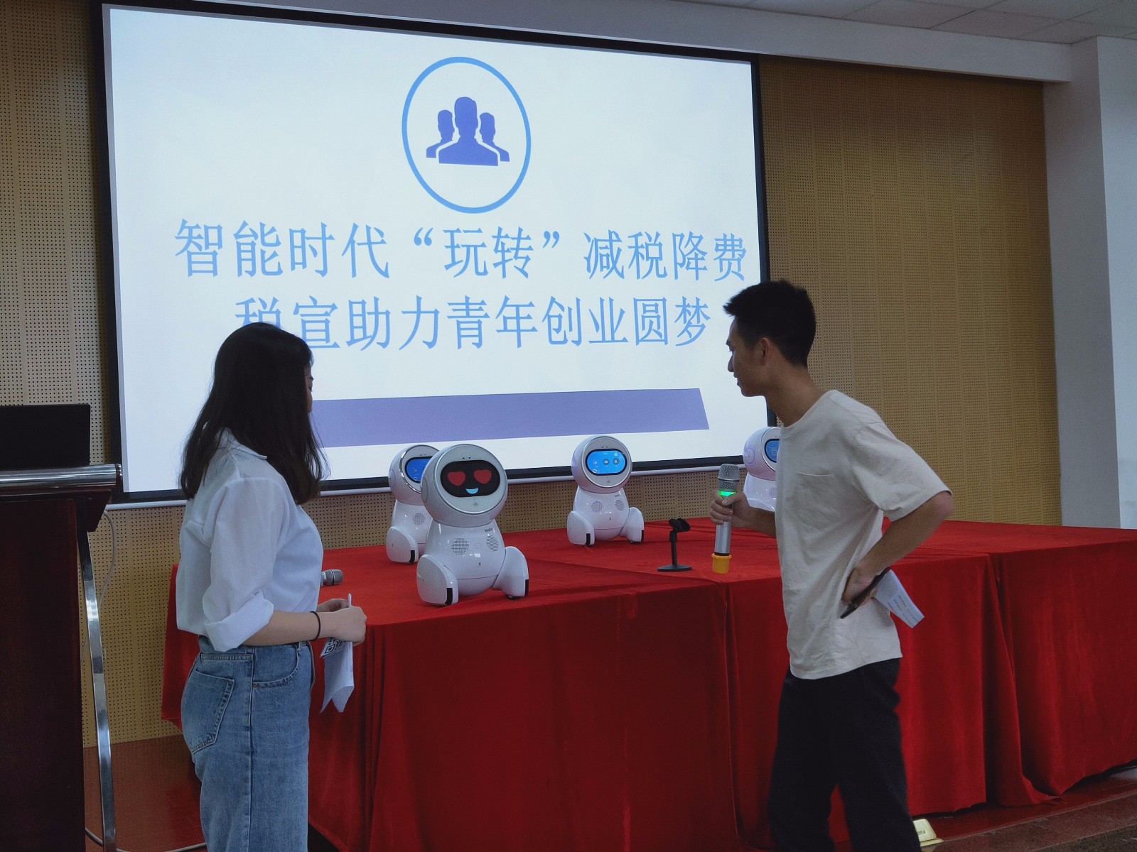 活动在智童时刻机器人KEEKO带来的《税务的新时代》群舞中拉开帷幕。同安区税务局税务干部吴凌昱向东海学子介绍了创业税收优惠政策及新办纳税人登记流程,为现场同学答疑解难。随后,机器人KEEKO就创业问题与现场人员进行互动。最后,智童时刻董事长郭长琛向大家分享创业经验,尤其强调知识产权保护的重要性。