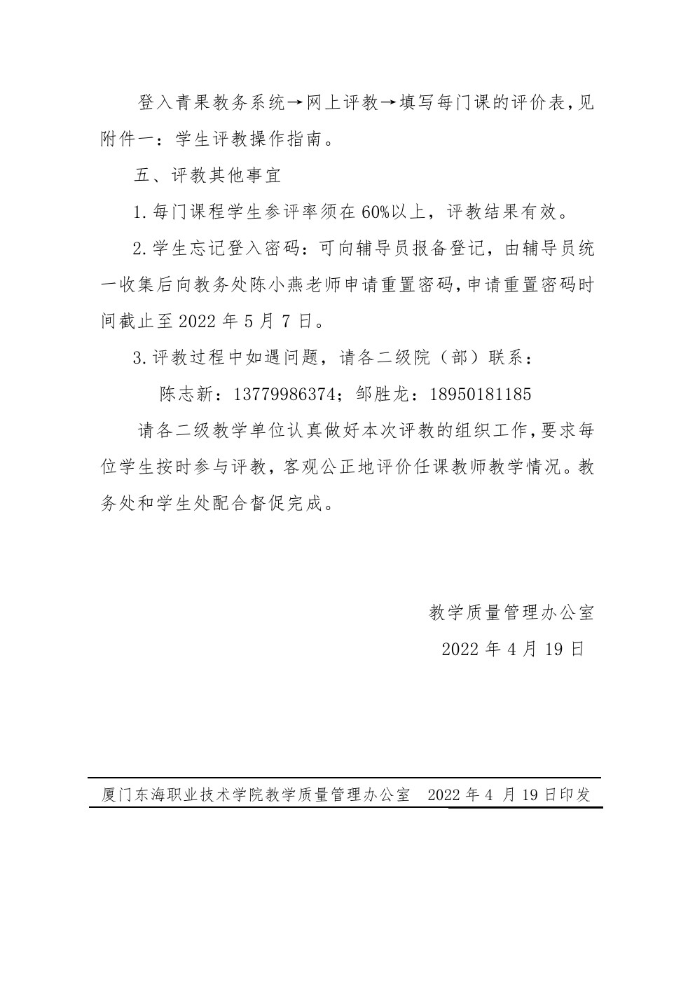 东海职院质管〔2022〕6号 关于开展2021-2022学年第二学期期中学生《线下教学网上评教》的通知