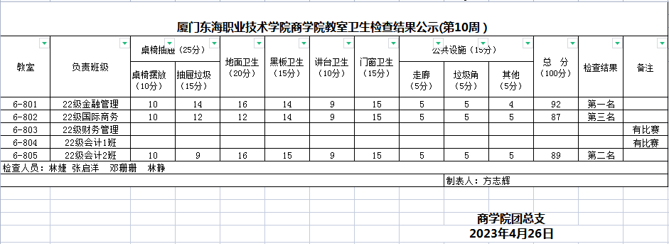 2022-2023学年第二学期商学院第10周班级卫生评比